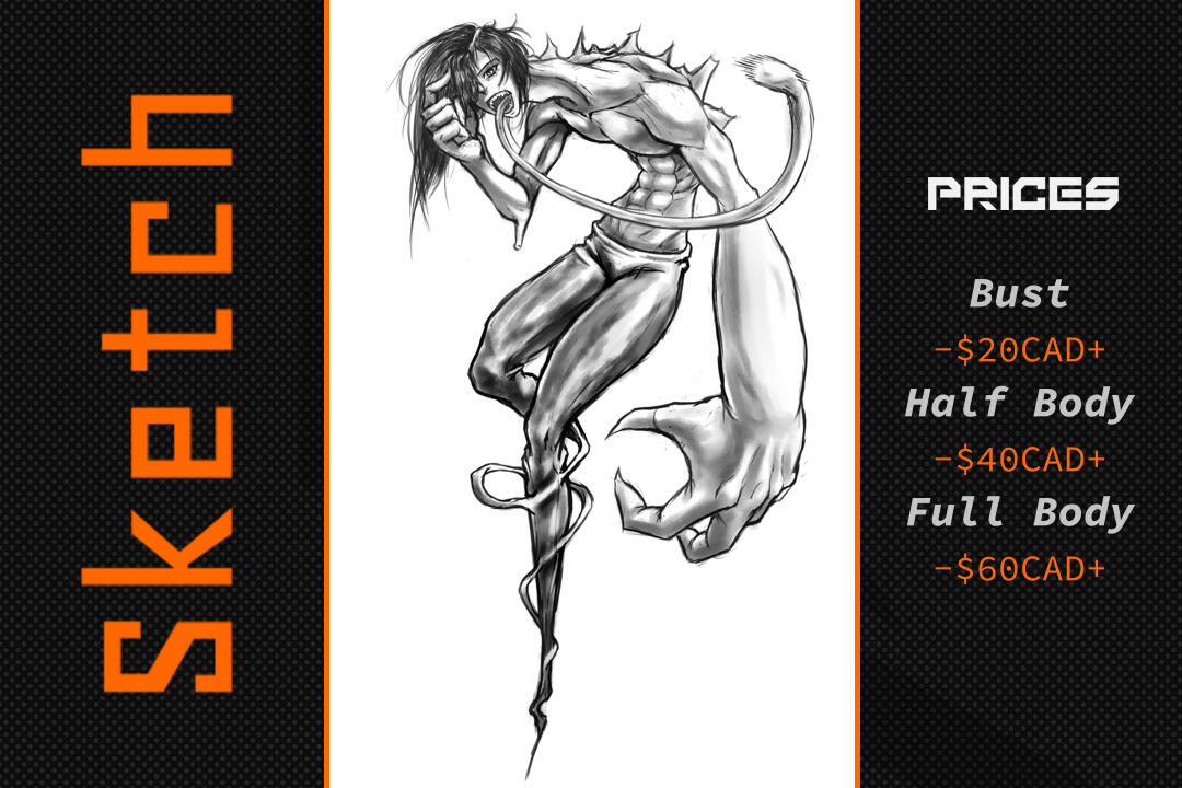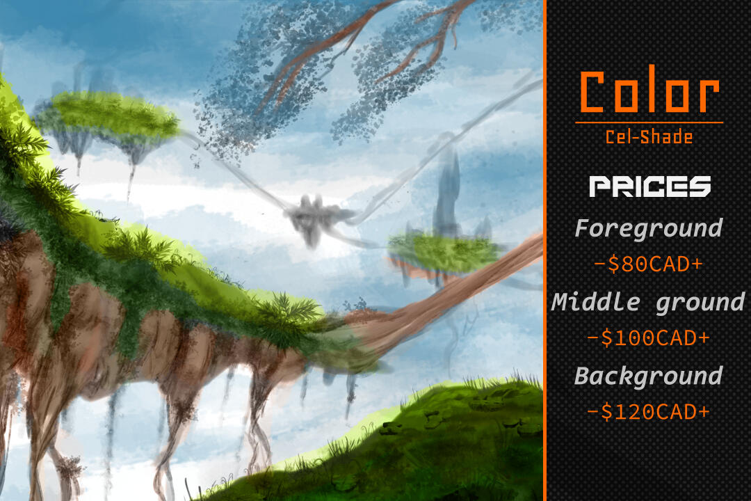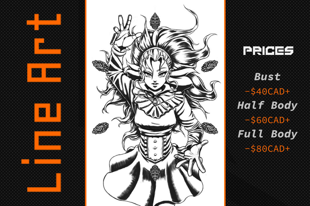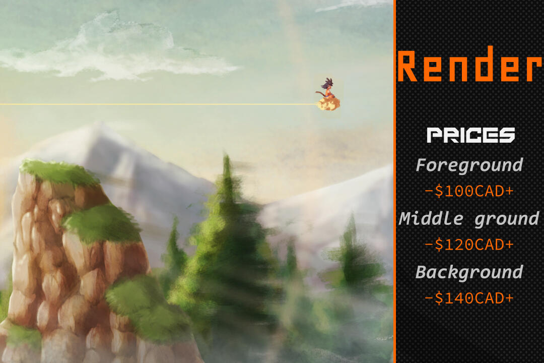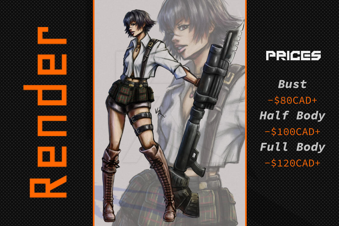 +1 Extra item (Arme, Véhicule) = Jusqu'à 20% du prix de base.Notes : Le prix peut augmenter ou diminuer dépendamment du niveau de difficulté.Si vous voulez un simple fond (ex : un carré coloré), je ne vous chargerais pas pour ça. Mais je vous chargerais un supplément si vous voulez quelque chose de plus complexe pour accompagner votre personnage.Soyez assuré de m'envoyer toutes les références utiles pour que je puisse compléter votre commission.Pour plus de questions, vous pouvez me contacter.