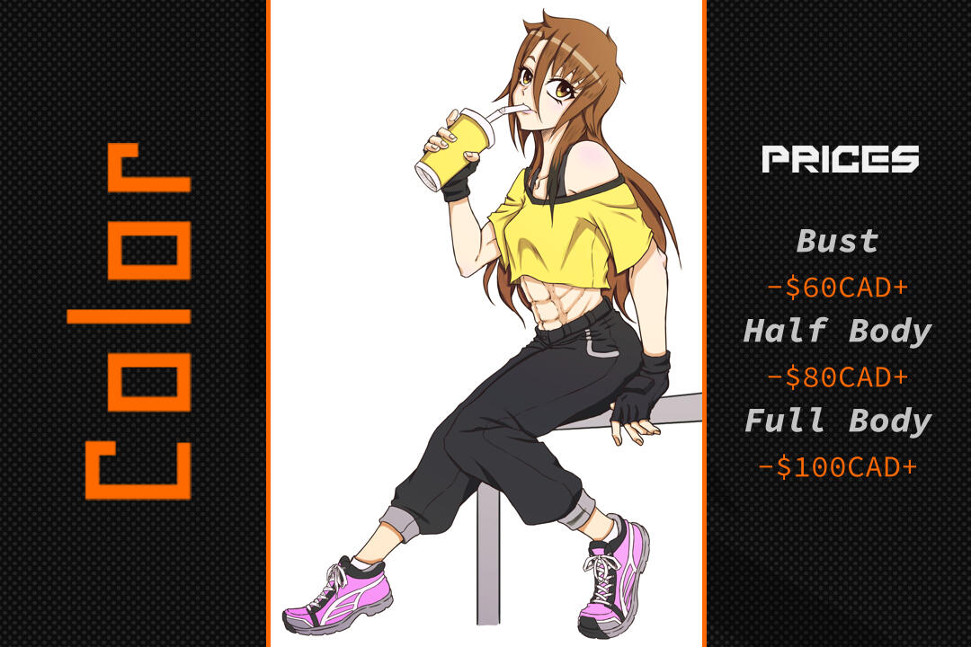 +1 Extra item (Weapon, Vehicle) = Up to 20% of the base price.Notes : Prices can increase or decrease depending on the level of difficulty.If you wish to have a simple background (ex: a coloured square), I'll not charge you. But I'll have to charge you if you want something more complex to accompany the character.Make sure to provide any references I would need to complete your commission.For any more questions, you can contact me.